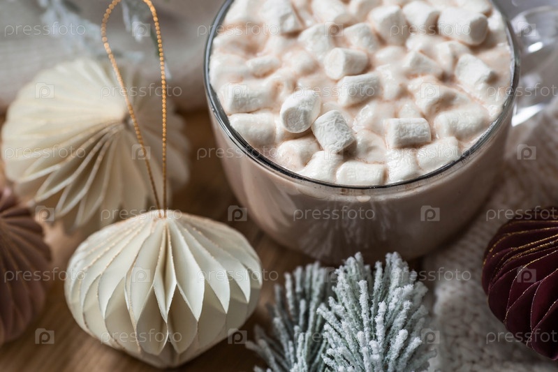 Стильные бумажные елочные игрушки и стакан с горячим шоколадом, зефир на деревянном фоне. Бежевые тона. Вид сверху. Баннер для дизайна, веб-страниц