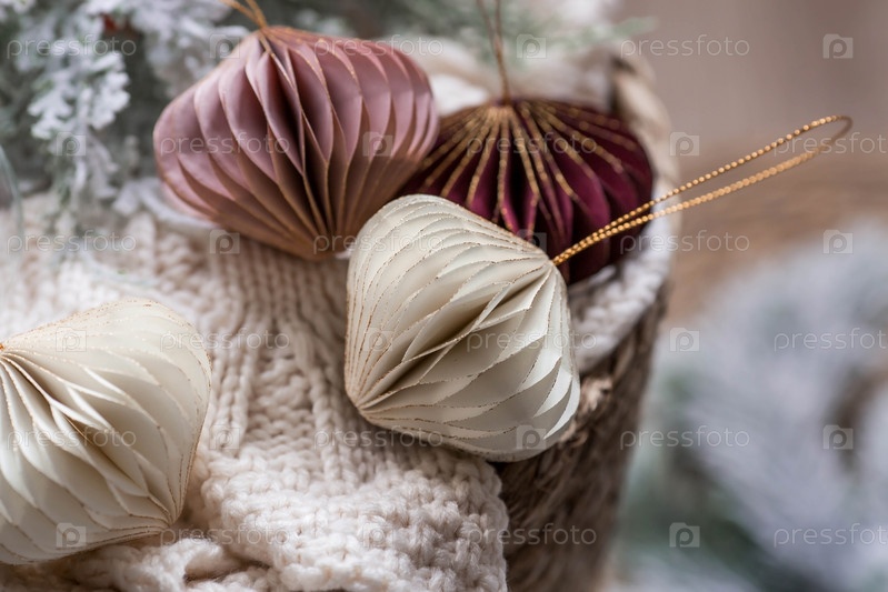 Стильные бумажные елочные игрушки в скандинавском стиле. Бежевые тона. Вид сверху. Баннер для дизайна, веб-страниц. Концепция стильного нового года и Рождества 2023