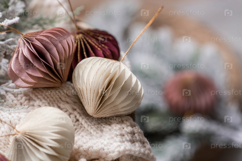 Стильные бумажные елочные игрушки в скандинавском стиле. Бежевые тона. Вид сверху. Баннер для дизайна, веб-страниц. Концепция стильного нового года и Рождества 2023