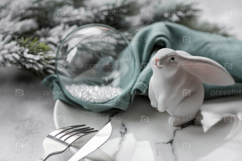 Красивая праздничная открытка. Концепция счастливого нового года и Рождества. Символ года — белый кролик на фоне еловых веток и цифры 2023