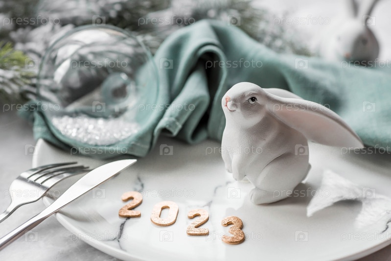 Красивая праздничная открытка. Концепция счастливого нового года и Рождества. Символ года — белый кролик на фоне еловых веток и цифры 2023