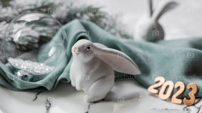 Красивая праздничная открытка. Концепция счастливого нового года и Рождества. Символ года — белый кролик на фоне еловых веток и цифры 2023