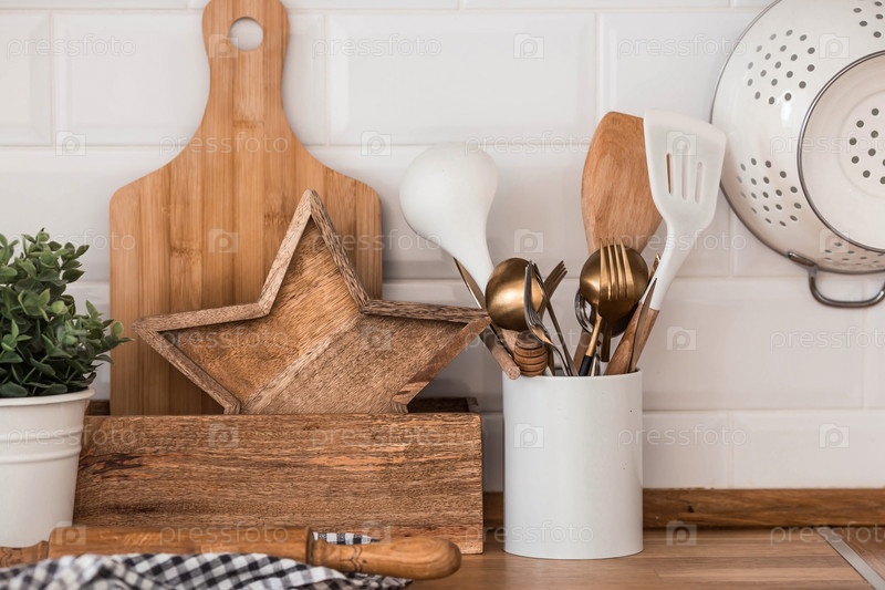Посуда и столовые приборы на кухонной деревянной столешнице, готовые к приготовлению. Белая современная кухня в скандинавском стиле, детали кухни