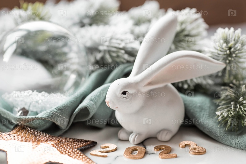 Красивая праздничная открытка. Концепция счастливого нового года и Рождества. Символ года — белый кролик на фоне еловых веток и цифры 2023