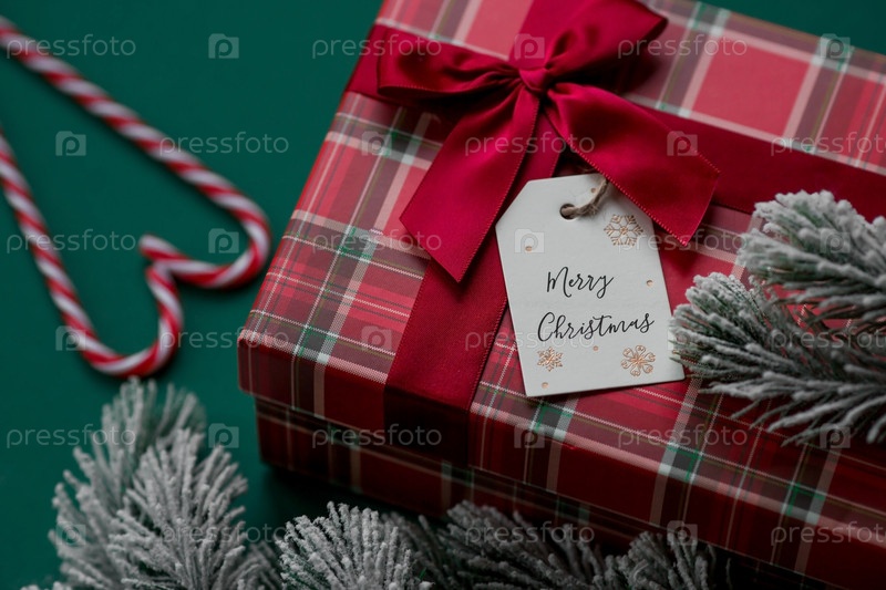 Красная подарочная коробка в клетке, этикетка с надписью «Счастливого Рождества» и еловые ветки на зеленом фоне. Рождество 2023. Традиционные цвета. Покупка и подготовка подарков для родных и близких