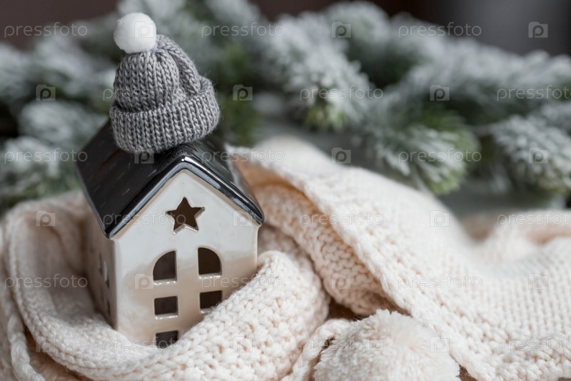 Дом, закутанный в шарф. Зима. Утепление дома, защита от холода и непогоды, система отопления помещений. Энергетический кризис в Европе. Праздничное настроение, Рождество, Новый год 2023