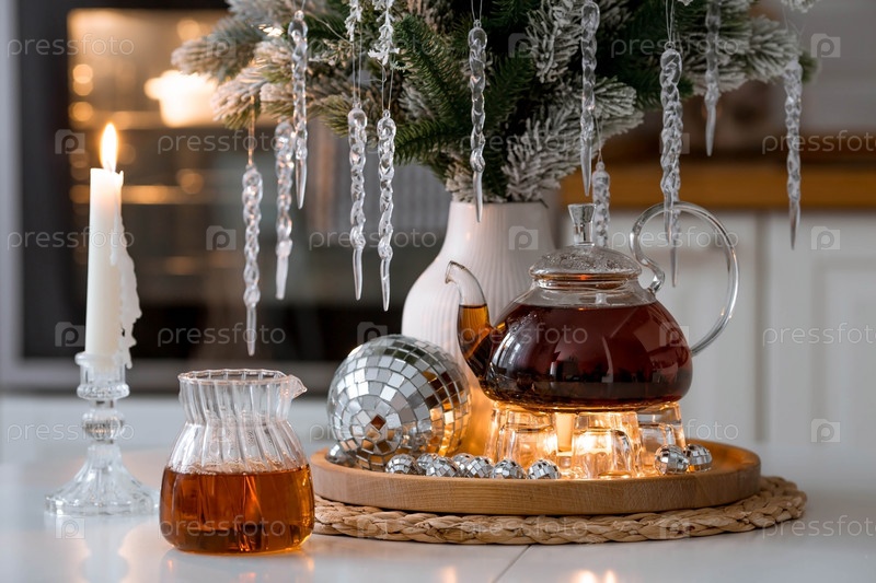 Букет еловых веток с сосульками, свечи и чайник с чаем на деревянном столе в домашнем интерьере белой кухни в скандинавском стиле. Уютная концепция праздничных напитков
