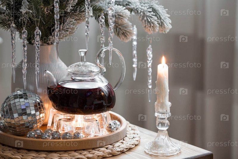 Букет еловых веток с сосульками, свечи и чайник с чаем на деревянном столе в домашнем интерьере гостиной. Уютная концепция праздничных напитков