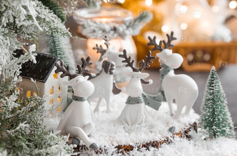 С Новым 2023 годом. Рождественская открытка, баннер с забавными оленями и елками на заднем плане - красивое боке. Новогодний натюрморт. Концепция домашнего праздника, тепла и уюта