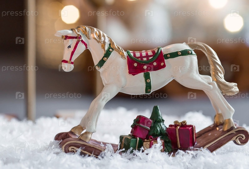 С Новым 2023 годом. Рождественская открытка, баннер с лошадкой-качалкой, елки, подарки и красивое боке на заднем плане. Концепция домашнего зимнего отдыха, тепла и уюта