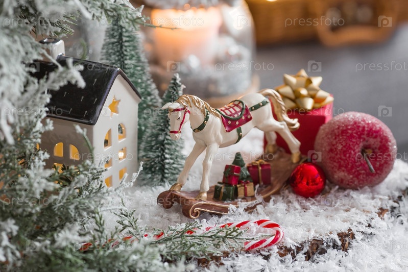 С Новым 2023 годом. Рождественская открытка, баннер с лошадкой-качалкой, елки, подарки и красивое боке на заднем плане. Концепция домашнего зимнего отдыха, тепла и уюта