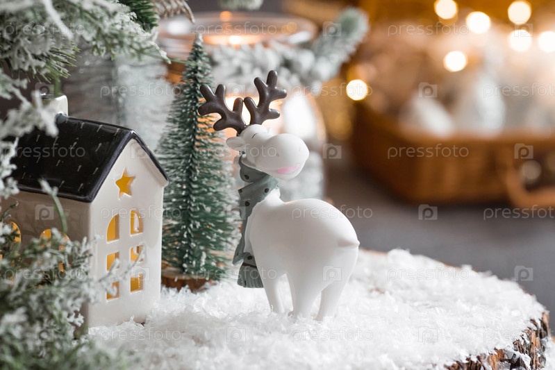 С Новым 2023 годом. Рождественская открытка, баннер с забавными оленями и елками на заднем плане - красивое боке. Новогодний натюрморт. Концепция домашнего праздника, тепла и уюта
