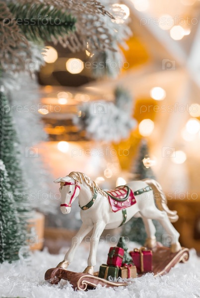 С Новым 2023 годом. Рождественская открытка, баннер с лошадкой-качалкой, елки, подарки и красивое боке на заднем плане. Концепция домашнего зимнего отдыха, тепла и уюта