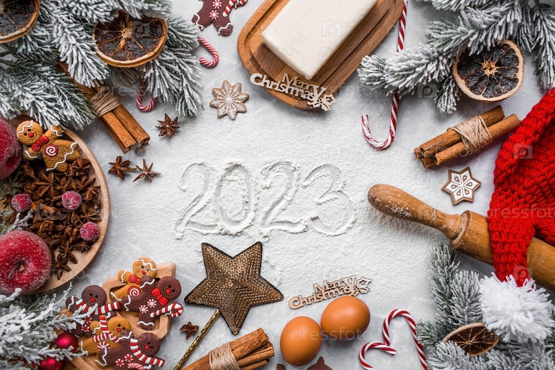 С Новым 2023 годом. Баннер с кухонной утварью, рождественскими украшениями, корицей, пряниками и елью на мраморном фоне. Поздравительная открытка на Рождество. Концепция кафе и ресторанов