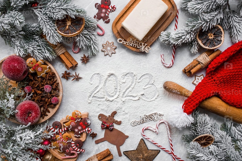 С Новым 2023 годом. Баннер с кухонной утварью, рождественскими украшениями, корицей, пряниками и елью на мраморном фоне. Поздравительная открытка на Рождество. Концепция кафе и ресторанов