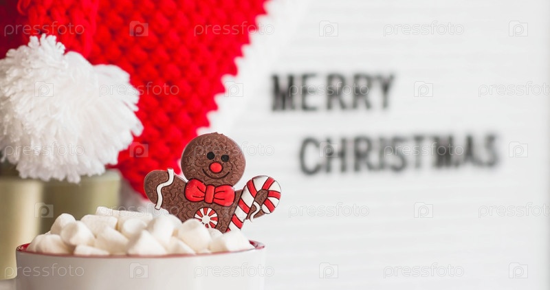 Табличка с надписью "Счастливого Рождества, шляпа Санты, кружка с горячим какао, зефир и пряничный человечек на фоне красивого боке". Уютная концепция Нового года и зимних праздников