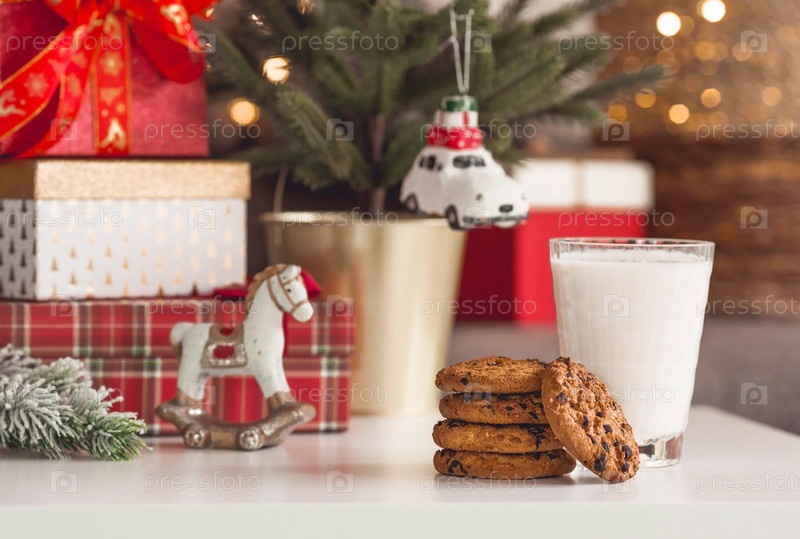 С Рождеством 2023. Красивый фон с шоколадным печеньем и стаканом молока для Санта-Клауса. Празднование зимних новогодних праздников. Концепция начала года