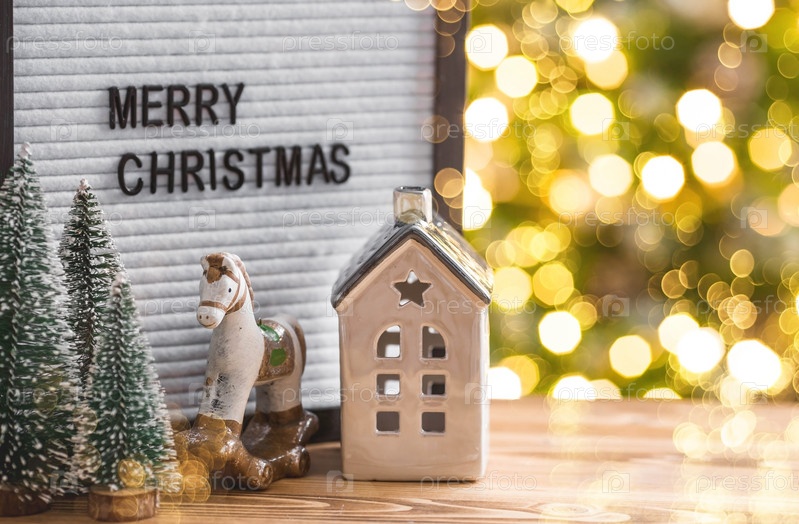Табличка с надписью "Счастливого Рождества" на деревянном столе. Красивое боке на золотом фоне. Новогодний фон 2023 для демонстрации или инсталляции продукции и товаров