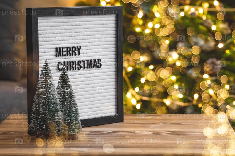 Табличка с надписью "Счастливого Рождества" на деревянном столе. Красивое боке на золотом фоне. Новогодний фон 2023 для демонстрации или инсталляции продукции и товаров