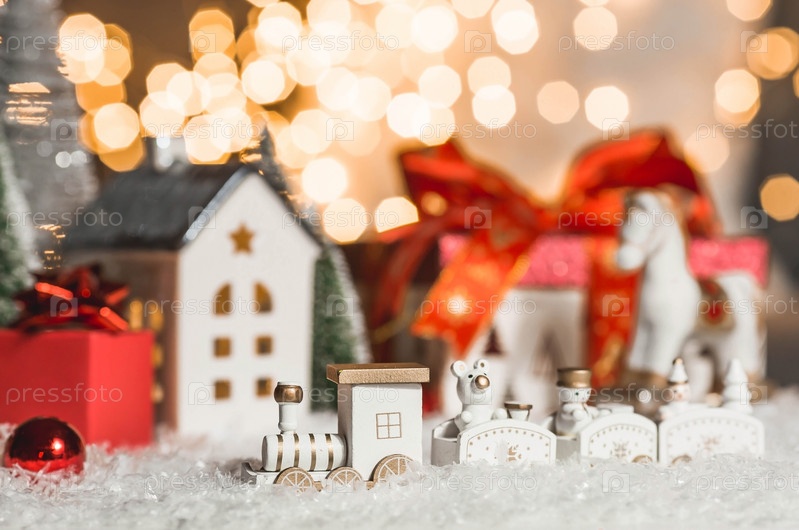 С Новым 2023 годом. Красивый фон с рождественским локомотивом, снегом и подарком. Празднование зимних рождественских каникул. Концепция начала года