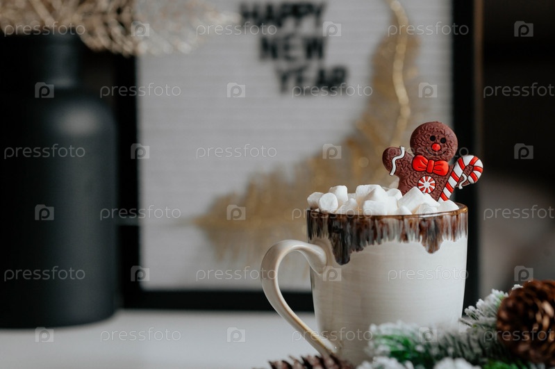 Табличка с надписью «С Новым годом», кружка с горячим какао, зефир и пряничный человечек на фоне красивого желтого боке. Уютная концепция Рождества и зимнего отдыха
