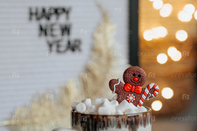 Табличка с надписью «С Новым годом», кружка с горячим какао, зефир и пряничный человечек на фоне красивого желтого боке. Уютная концепция Рождества и зимнего отдыха