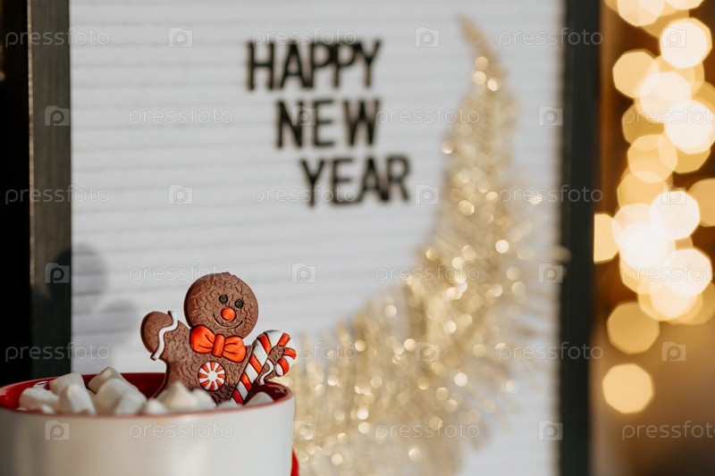 Табличка с надписью «С Новым годом», кружка с горячим какао, зефир и пряничный человечек на фоне красивого желтого боке. Уютная концепция Рождества и зимнего отдыха