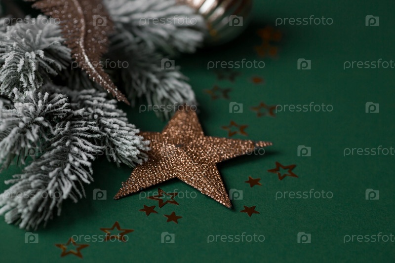 Баннер. С Новым Годом. Золотые числа 2023, еловые ветки, елочные игрушки и золотые звезды на зеленом фоне. Плоская планировка
