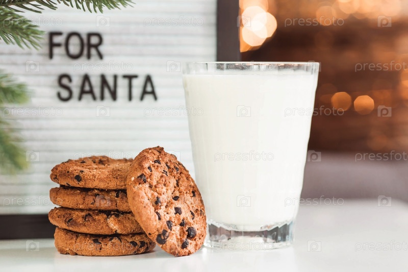 С Рождеством 2023. Красивый фон с шоколадным печеньем и стаканом молока для Санта-Клауса. Празднование зимних новогодних праздников. Концепция начала года