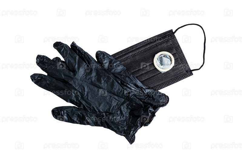 Черные латексные перчатки, медицинская маска и презерватив. Изолировать на белом фоне. Крупный план. вид сверху. Средства защиты от болезней и нежелательных последствий. Концепция предотвращения
