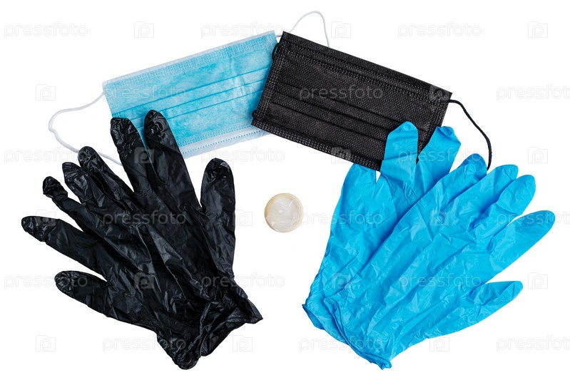 Две пары черных и синих латексных перчаток, две медицинские маски и презерватив. Концепция защиты от инфекций. Крупный план. Вид сверху. Изолированные на белом фоне