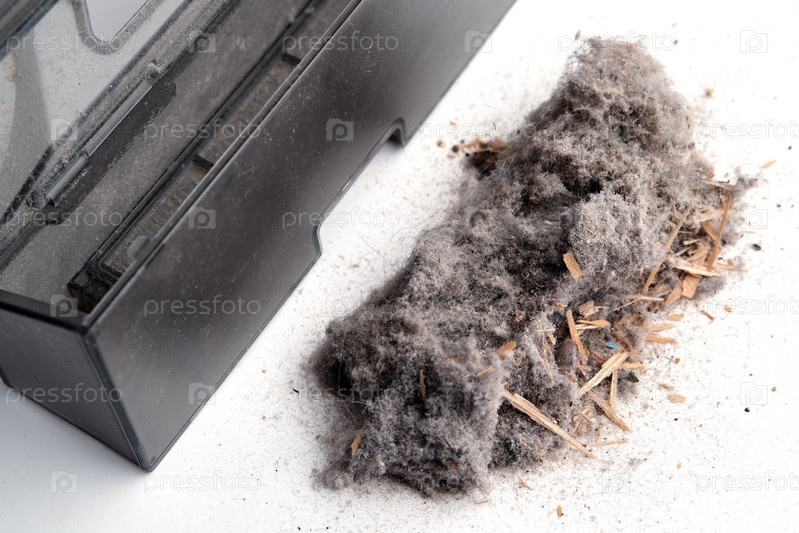 Пыль и мусор и фрагмент контейнера от робота-пылесоса на светлом фоне. Результаты уборки дома. Крупный план. Выборочный фокус