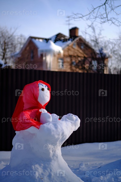 Снеговик в красной шали в виде фигурки с младенцем. Пригородный зимний пейзаж. Выборочный фокус