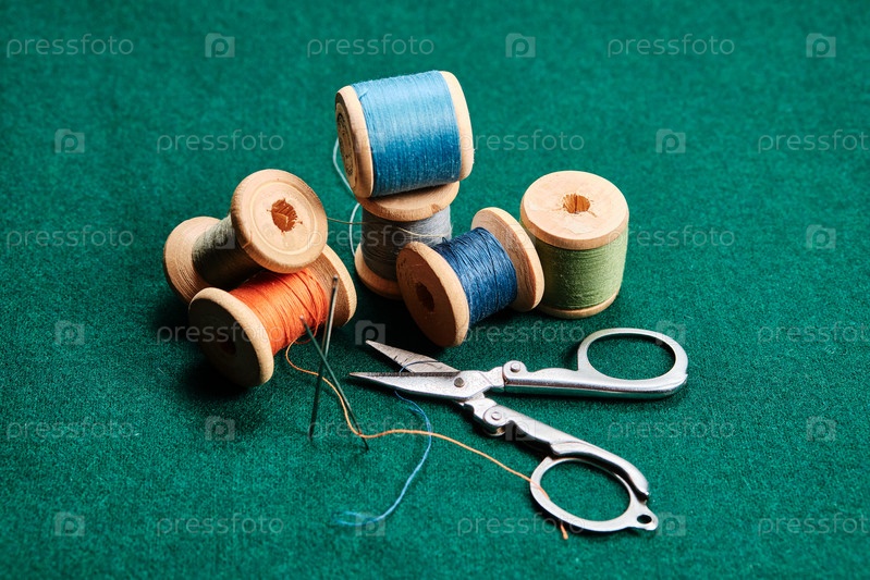 Старые деревянные катушки с разноцветными нитками и ножницами на зеленой ткани. Ретро натюрморт. Крупный план. Выборочный фокус