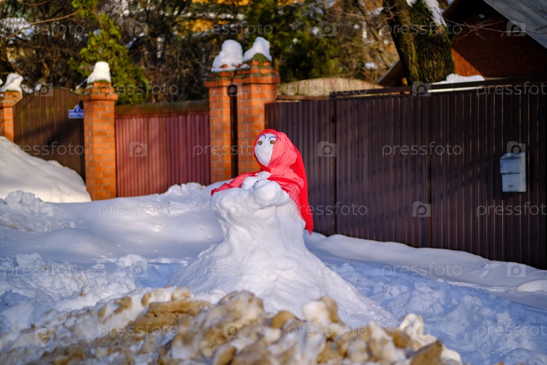 Снеговик в красной шали. Пригородный зимний пейзаж. Выборочный фокус