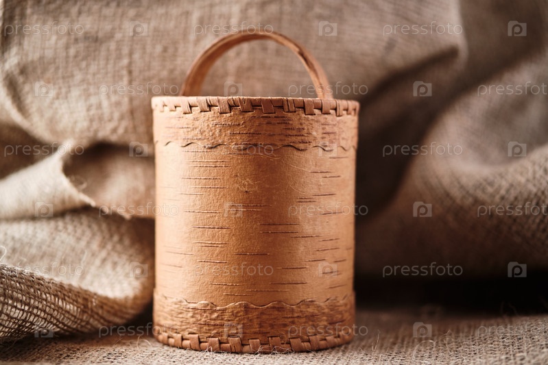 Шкатулка из бересты на фоне мешковины. Тара из бересты. Старинный натуральный пищевой контейнер. Деревенская домашняя кухонная утварь. Крупный план. Выборочный фокус