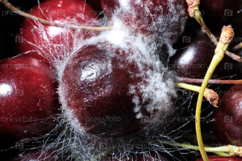 ягоды вишни и белая плесень. Испорченная еда. Крупный план. Выборочный фокус