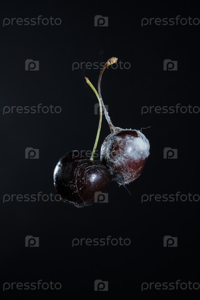 Две ягоды на черном фоне. Заплесневелые вишни. Виньетка. пространство для надписей и дизайна. Выборочный фокус