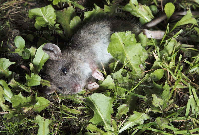 Большая серая мышь лежит в зеленой траве. Крупный план. Выборочный фокус