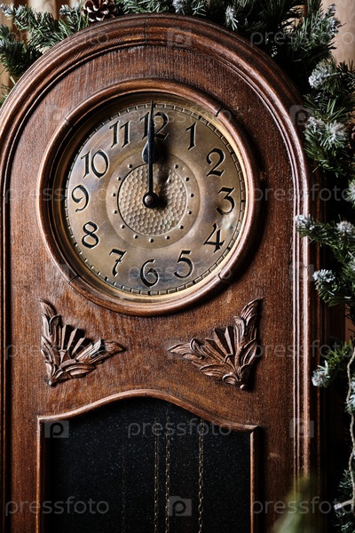 Большие старые пыльные часы показывают 12 часов. Крупный план. Новогодняя атмосфера. Выборочный фокус
