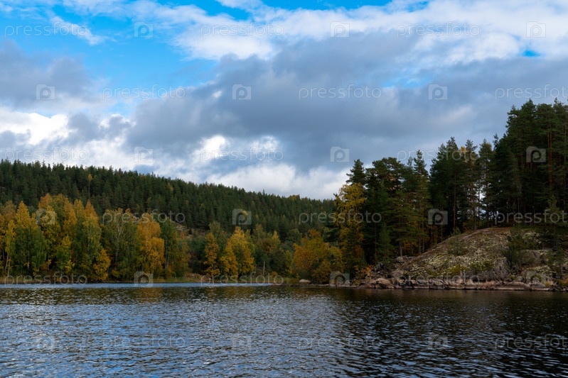 Вид на Ладожское озеро у поселка Лумиваара в солнечный осенний день, Ладожские шхеры, Республика Карелия, Россия