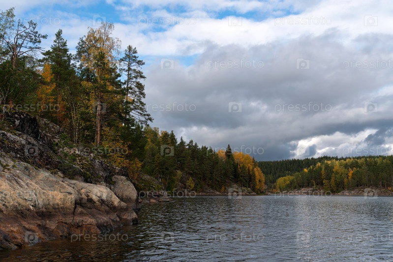 Вид на Ладожское озеро у поселка Лумиваара в солнечный осенний день, Ладожские шхеры, Республика Карелия, Россия