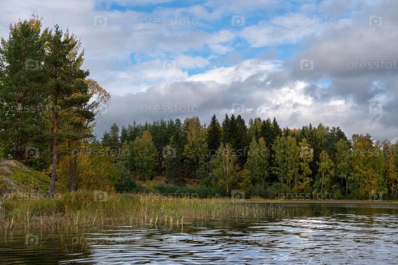 Вид на Ладожское озеро у поселка Лумиваара в солнечный осенний день, Ладожские шхеры, Республика Карелия, Россия