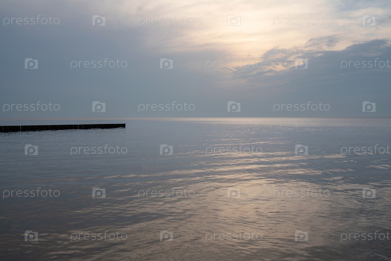 Вид на деревянные волнорезы на фоне закатного неба и штиля на Балтийском море, Светлогорск, Калининградская область, Россия