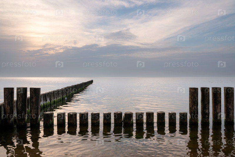 Вид на деревянные волнорезы на фоне закатного неба и штиля на Балтийском море, Светлогорск, Калининградская область, Россия
