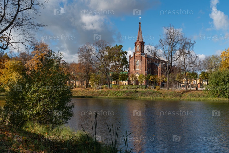Вид на лютеранскую церковь Воскресения Христова в Царском Селе на берегу 4-го Нижнего пруда в солнечный осенний день, Пушкин, Санкт-Петербург, Россия