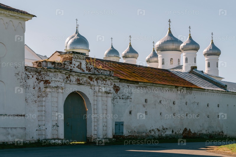 Вид на стену Георгиевского (Юрьевского) монастыря и купола Спасского собора в солнечный летний день, Великий Новгород, Россия
