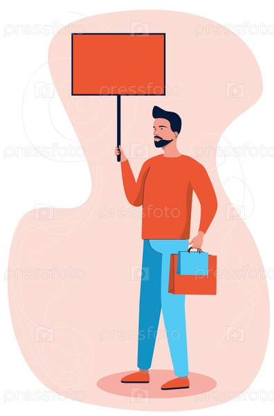 Человек с красным знаменем и сумками для покупок