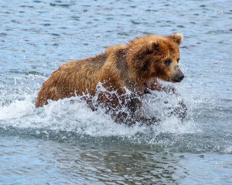 Бурый медведь охотится на лосося