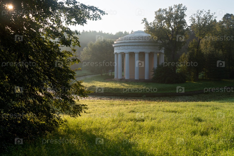 Вид на Храм Дружбы на берегу реки Славянка в Павловском дворцово-парковом комплексе туманным летним утром, Санкт-Петербург, Россия